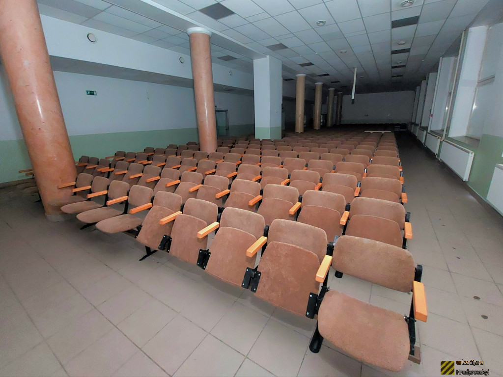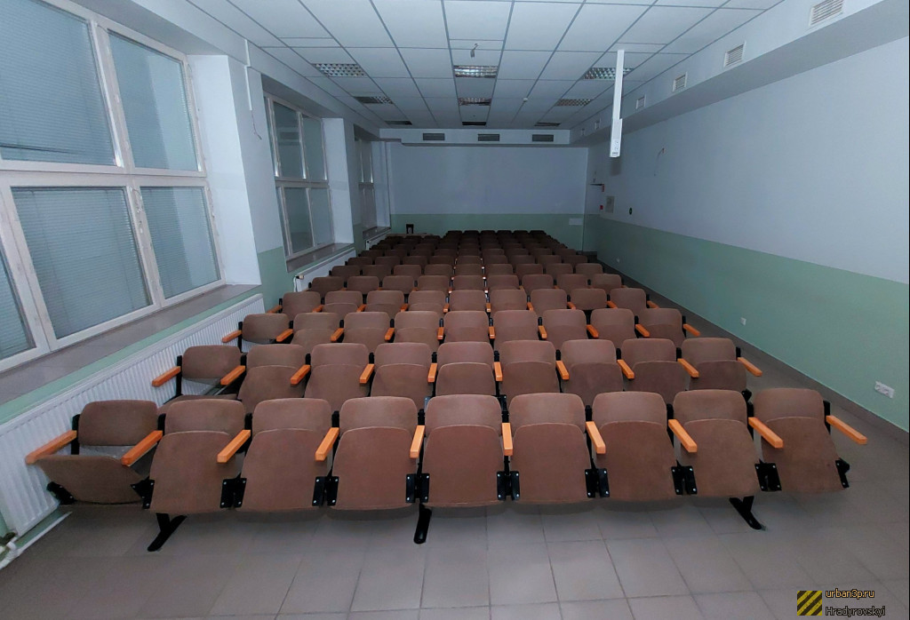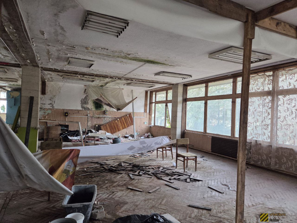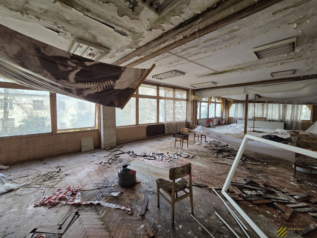 Профилакторий представляет из себя 4-х этажное здание. Внутри особо ничего интересного нет, в некоторых комнатах осталась отделка стен и потолка, само здание изрисованы граффити. Вход на объект свободный, охраны нету.