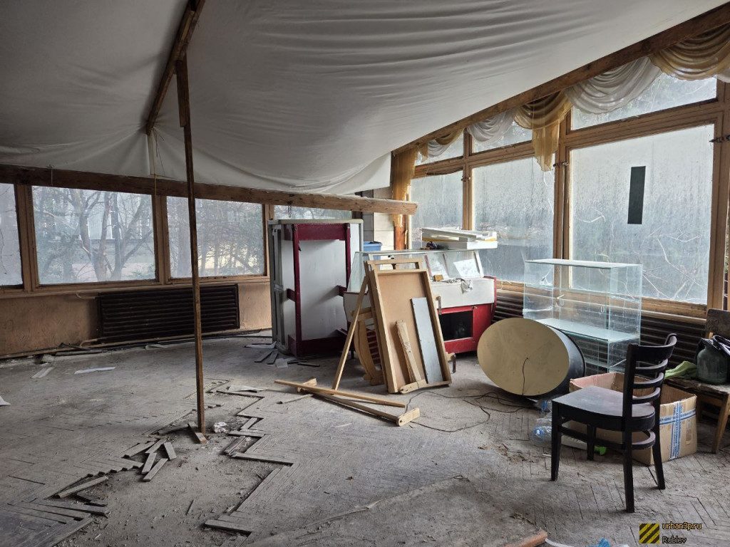 Все входы заколочены. Вокруг мощная поросль кустарника и трав. Наклеены объявления, что объект охраняется. Местные действительно присматривают за ним.