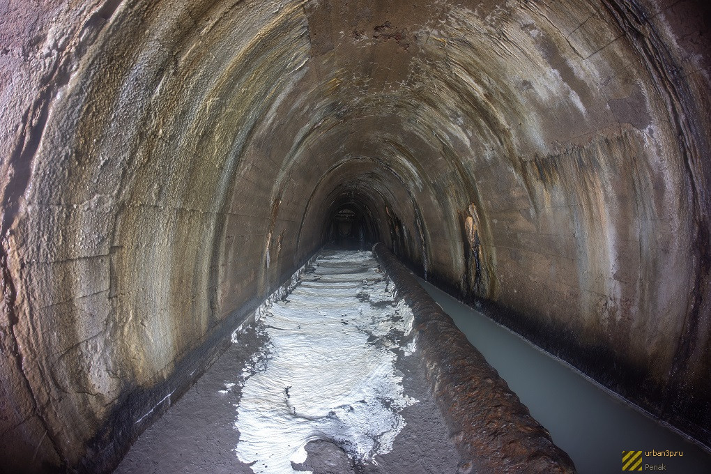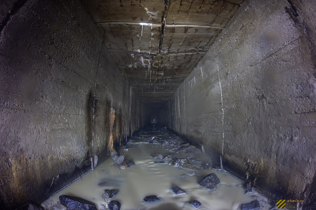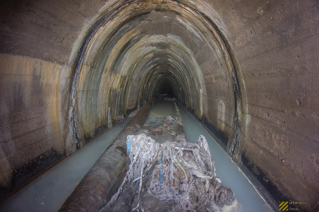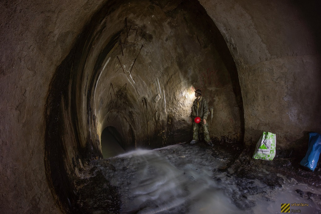 Основной участок арочного коллектора (длина ~1км, высота около 3,5м) проходим в бахилах.