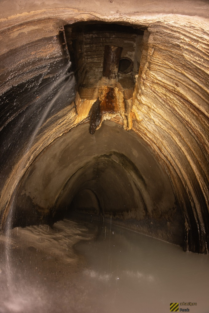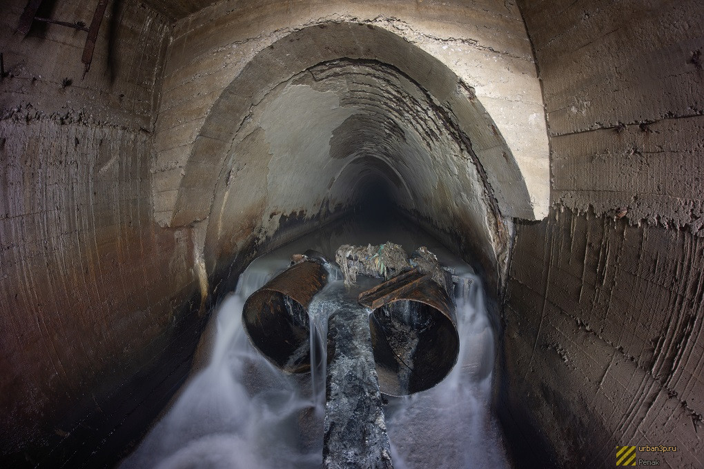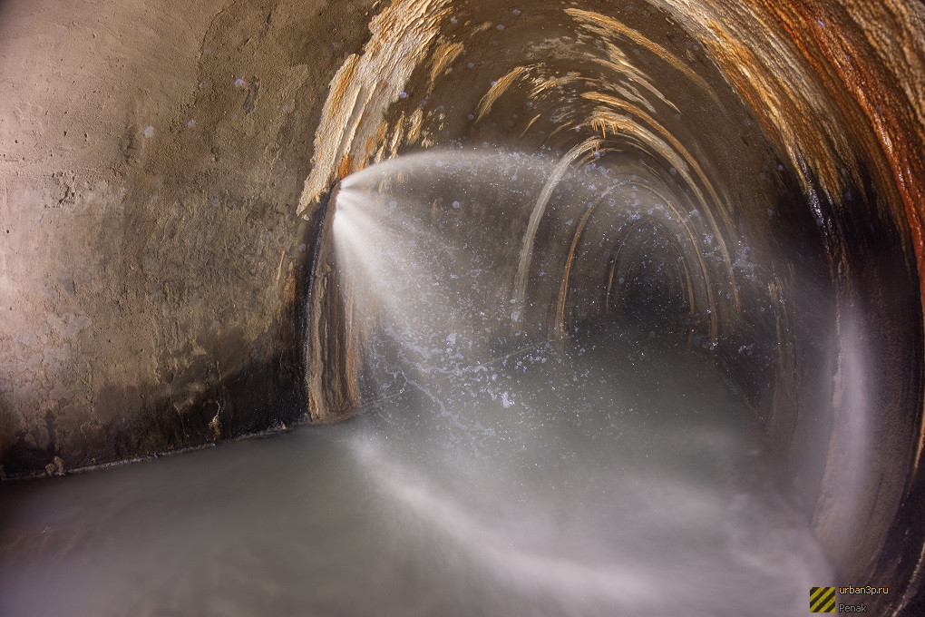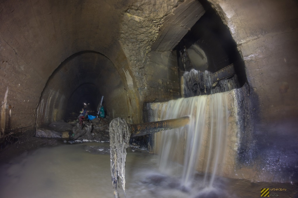 Далее, ~20мин пути, пол коллектора занимают две большие трубы из-за чего его высота снижается до 2м. На пути встречается камера с подключением нескольких ливневок. Самая большая диаметром около метра.