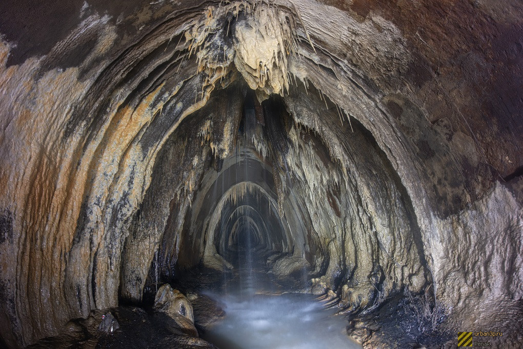 Ниже по течению есть две водобойные камеры проходимые в малую воду в Л1. Они начинаются резкими спусками (второй спуск высотой ~6м). После них еще одна сталактитная галерея с характерными для пещер маленькими шарообразными "сталагмитами".