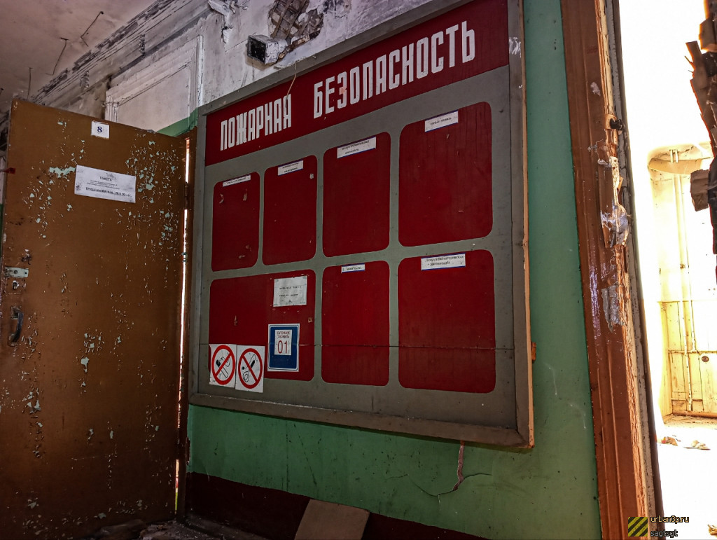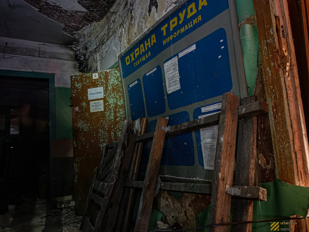 Само здание полностью заброшено, в кабинета осталось почти вся мебель на месте, присутствуют атрибуты завода: плакаты, календарик, фотки, и прочие вещи. Все в довольно хаотичном состоянии разбросано. Первый этаж менее интересен, присутствуют следы проживания бомжей.