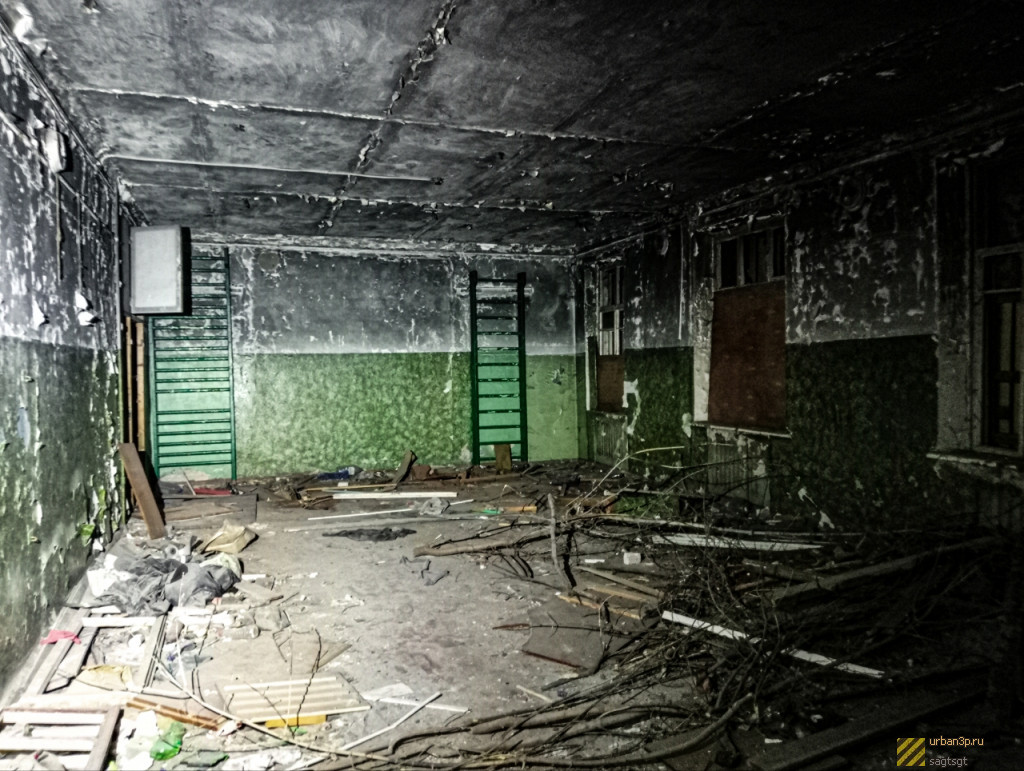 Первый этаж уничтожен, на втором получше. Есть необходимые кабинеты для занятий, мастерская, кабинеты совещаний преподавателей и спортзал, две лестницы, одна основная, и вторая пожарная. На территории есть котельная, так как здание строилось с расчетом на печное отопление. Спортплощадка и футбольное поле используется местными для занятий спортом.