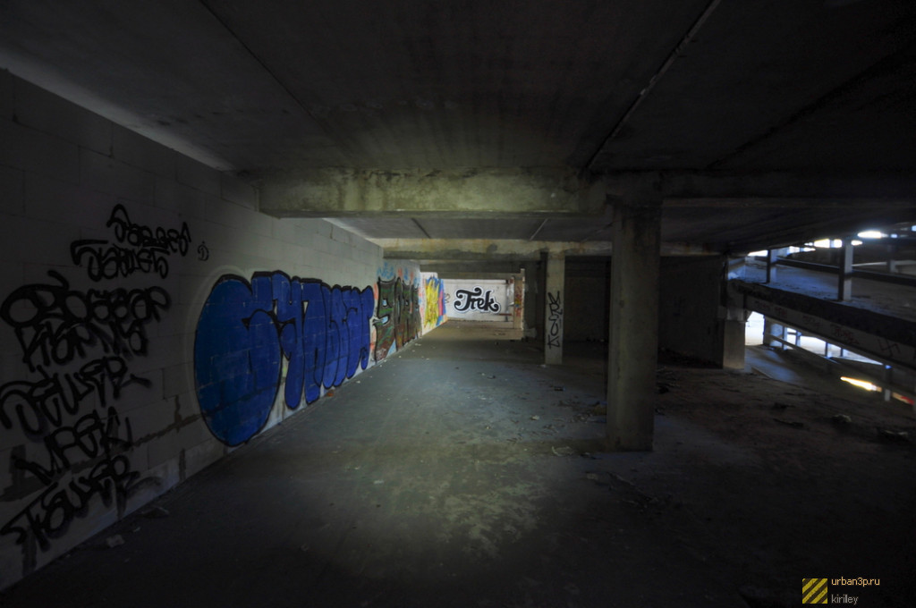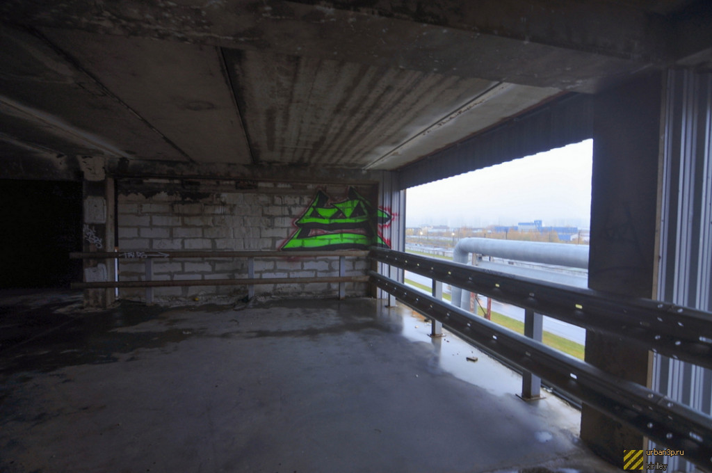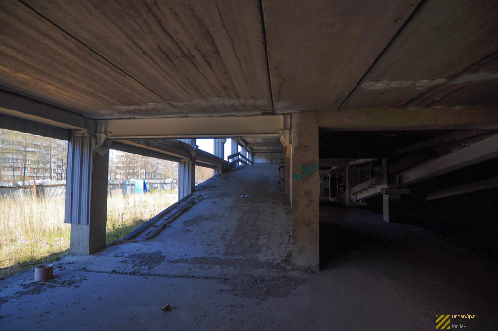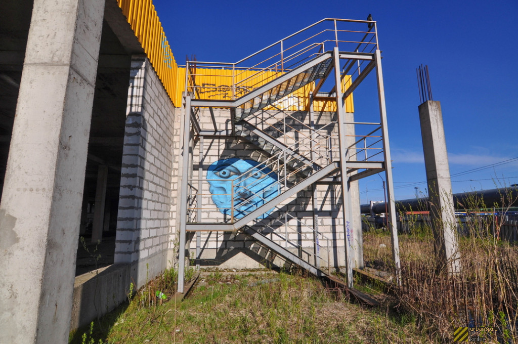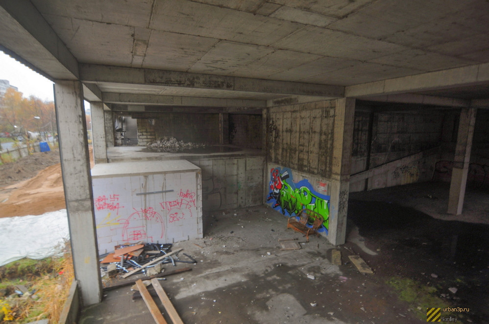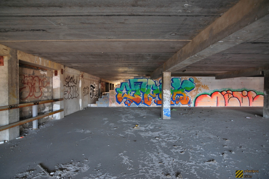 Состоит из двойного недостроенного здания, каркаса ещё одного и затопленного котлована под третье. Окружено лесом.